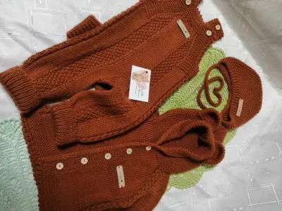 Приветствую всех творческих людей. Сегодня снова делюсь с вами своей работой, которую выполнила на заказ. Заказчица осталась довольна, меня результат тоже порадовал. костюмчик вязала пряжей "Пехорка детский каприз" 50% шерсть, 50% фибра, в 50 гр 225м. Цвет кирпичный. спицы 2,5 в две нити. Очень люблю эту пряжу, она идеально подходит для вязания детских вещей. после ВТО раскрывается и изделие выглядит просто идеально. Пряжа не линяет, не садится, не растягивается, прекрасно держит форму при правильном уходе. Кофточка связана регланом сверху, штанишки снизу вверх, учтена анатомическая форма малыша, вывязан росток по спинке и на кофточке и на штанишках. Для придания законченности все изделие обвязала крючком. Вдохновляйтесь, вяжите с удовольствием, легких вам петелек. В подарок к заказу связала пинетки, фото в конце поста.