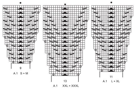 Когда провяжете полный вертикальный раппорт узора A.1, у вас будет 180-180-200-200-220-220 п., а длина вязания будет составлять около 15-15-16-16-17-17 см от наборного ряда.