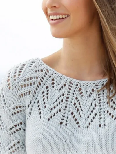Туника вяжется вкруговую сверху вниз на круговых/чулочных спицах.