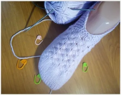 ! ! ! Второй тапочек вязать аналогично, изменив только направление вытянутых петель в узоре.