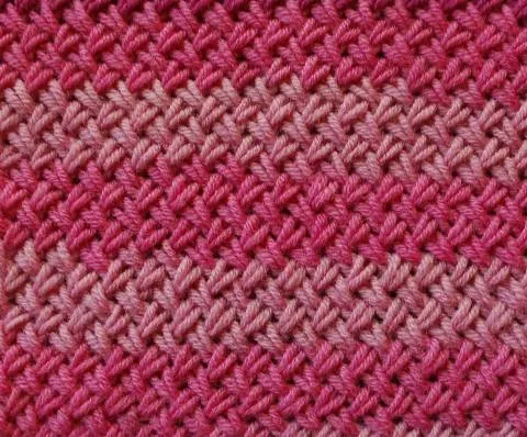 1 ряд: подхватить правой спицей вторую петлю позади первой и провязать ее лицевой, затем провязать лицевой первую петлю, после чего сбросить обе петли со спицы. Так продолжить вязать все петли до конца ряда.