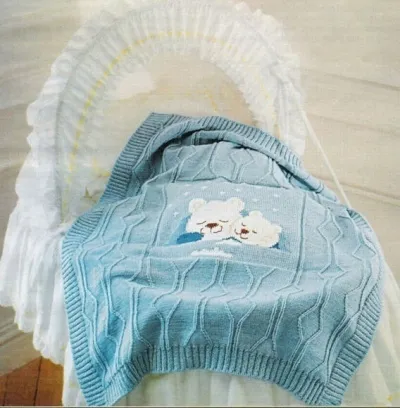 Плед: на спицы № 3 набрать 178 п. и связать 4,5 см резинкой 2 х 2. Продолжить вязание узором по схеме 3, прибавив в 1-м р. 1 п. = 179 п., на протяжении 92 р. Затем вязать 51 п. узора по схеме 3, 77 п. лиц. гладью и 51 п. по схеме 3 симметрично на протяжении 120 р. Продолжить вязание всех п. узором по схеме 3 на протяжении 92 р., связать 4,5 см резинкой 2 х 2 и закрыть п. по рисунку. Общая высота около 90 см.