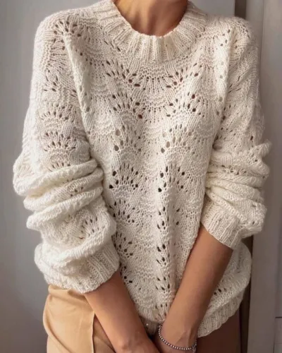 Легкость и элегантность: белый джемпер, связанный спицами