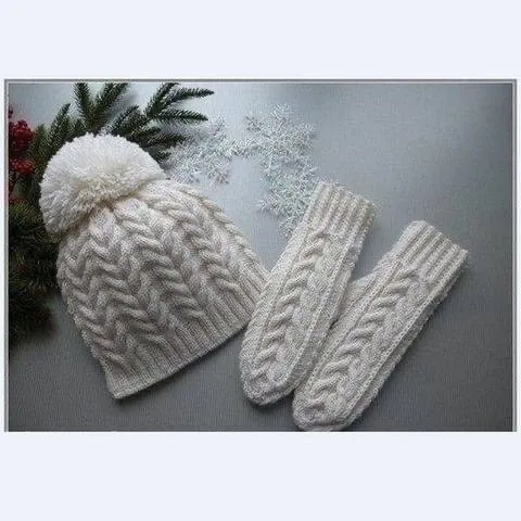 Шапочка и варежки связана на чулочных спицах вкруговую без швов и утеплены флисом. Варежки расшиты белым бисером в тон пряжи.