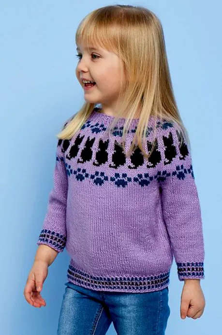 Кошечки и следы от их лапок украшают детский пуловер с круглой кокеткой.