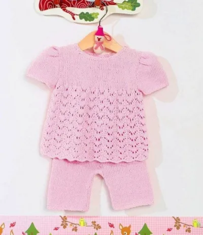Пряжа (100% мериносовой шерсти, экстратонкой; 220 м/50 г) – 150 (150) 200 г розовой; для туники: 2 маленькие розовые пуговицы; для штанишек: мягкая эластичная тесьма (шириной 1 см) по обхвату талии; спицы №3; короткие круговые спицы №3, крючок №2,5.