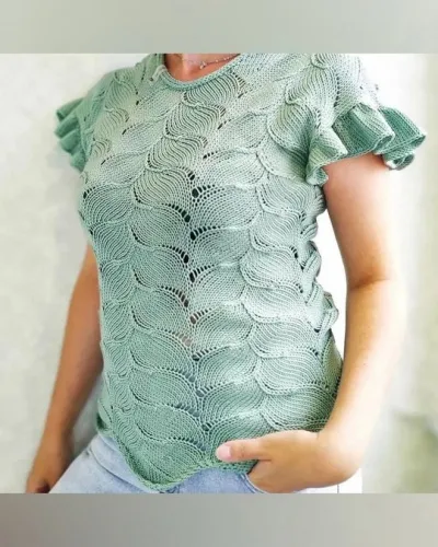 Для топа подойдут различные узоры — от простых лицевых и изнаночных петель до ажурных мотивов. Хорошо смотрятся топы, связанные гладью с ажурными вставками, что добавляет женственности и лёгкости.