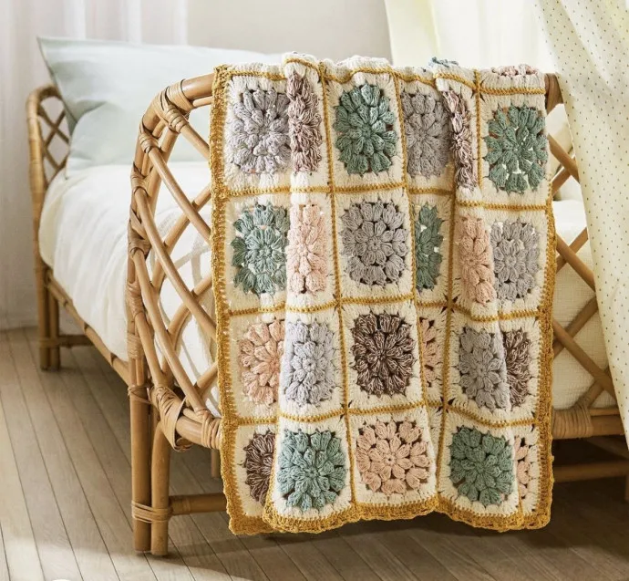 - Легкость в сборке. Каждый мотив вяжется отдельно, что делает процесс создания пледа увлекательным и удобным. Вы можете вязать мотивы поэтапно, не привязываясь к одному большому полотну, а затем соединить их в единый плед.