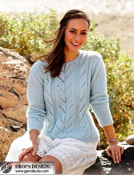 Материалы: пряжа DROPS AIR от Garnstudio 300-350-350-400-450-500 грамм, цвет № 18, светлый серо-зеленый; чулочные и круговые спицы (40+80 см) № 5 мм; спицы № 4 мм - для планок платочной вязкой.