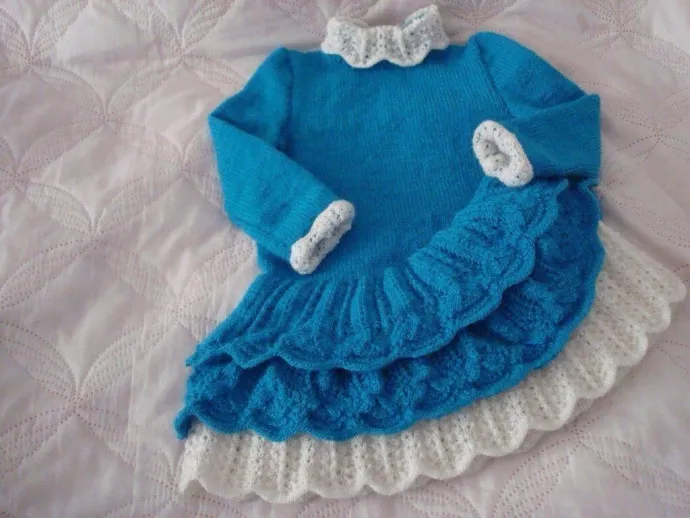 три моточка - синего цвета и один - белого, спицы №2. Оборки вязала в одну нить, а платье и рукава в две нити .Платье вязала вкруговую.