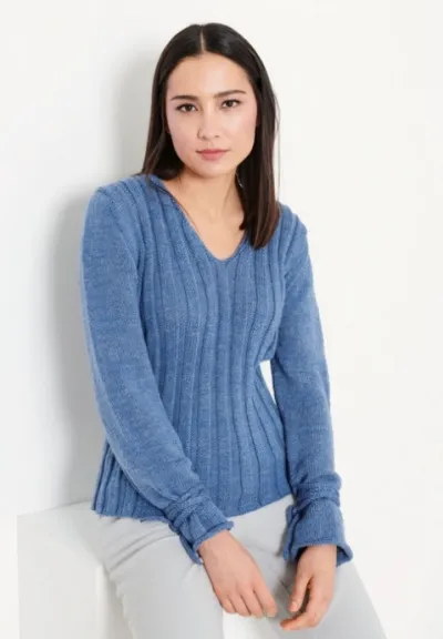 Вам потребуется: 350 (400) 450 г ярко-синей пряжи Lana Grossa «Slow Wool Lino» (85% мериносовой шерсти, 15% льна; 400 м/100 г); спицы № 3,5; 2 чулочные спицы № 3,5; круговые спицы № 3,5.