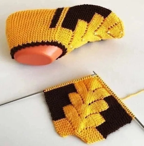 стороны и второй с другой), нитки двух цветов перекрещиваем, чтобы не было дырочек. Вяжем черным цветом: 5лиц; жёлтым цветом: 5лиц; накид; 1лиц; накид; 5лиц; черным цветом: 5лиц. Нечётные ряды вяжем по рисунку, по 5лиц. петель с двух сторон вяжем черным цветом (платочная вязка), желтым цветом: серединку. Так прибавляем по 1 петле с двух сторон,пока на спице не будет 31 петля (5+21+5). Черным цветом вяжем: 10лиц.(платочная вязка), желтым цветом: 5лиц; накид; 1лиц; накид; 5лиц; черным цветом: 10лиц. Нечётные ряды вяжем по рисунку, по 10лиц. петель с двух сторон вяжем черным цветом (платочная вязка)желтым цветом: серединку. Прибавляем по 1 петле с двух сторон,на спице должно получится 41петля (10+21+10)