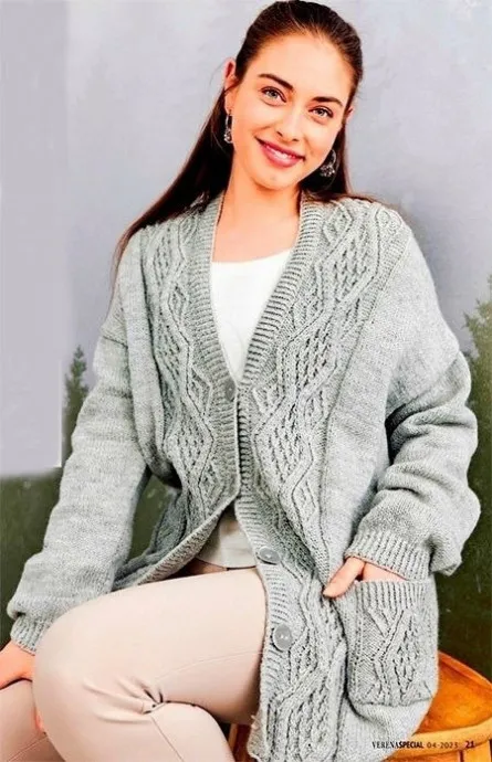 Пряжа (100% мериносовой шерсти; 150 м/50 Г) - 600 (650) 700 г светло-серой; спицы № 5 и 4,5; 4 круговые спицы № 4,5 длиной 150 см; 1 вспомогательная спица для вязания «кос»; 5 пуговиц диаметром 28 мм; 2 вспомогательные спицы для открытых петель.