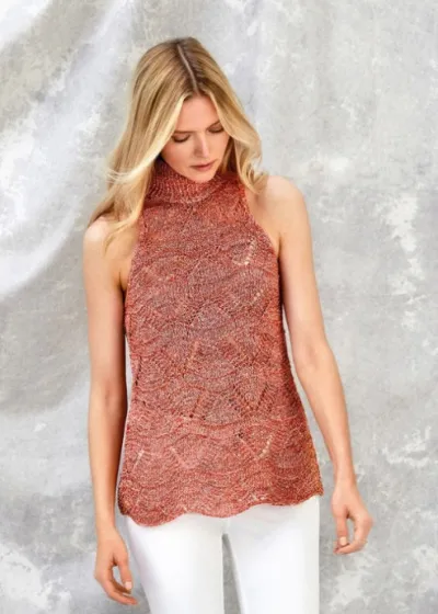Вам потребуется: 250 (300-350) г золотистой/медной/серо-зеленой/цвета мяты (цв. 102) или красной/оранжевой/цвета экрю (цв. 11) пряжи Alessia (76% хлопка, 20% рециклированного полиэстера, 4% полиэстера, 135 м/50 г) фирмы Lana Grossa; прямые спицы № 5 и круговые спицы № 4 длиной 40 см.