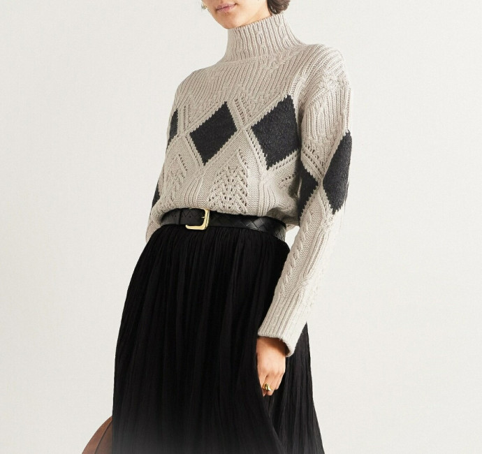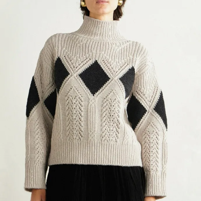 В верхней части свитера узор переходит в классическую резинку 1x1 с перекрещиваниями и необычными элементами, которые формируются обвитием петель.