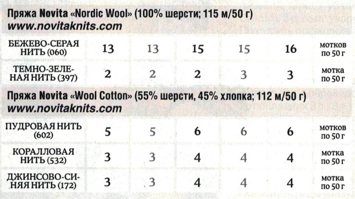 16 п. х 26 р. = 10 х 10 см, связано двойной нитью жаккардовым узором на спицах № 6.