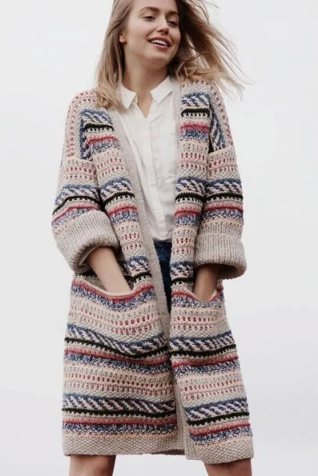 Длинный кардиган с «прорезными» карманами. Модель сочетает цветной узор с жемчужной вязкой и нитями протяжки на лицевой стороне работы,что создает необычный рельеф. За основу взяты два вида пряжи из чистой шерсти и смеси шерсти с хлопком.