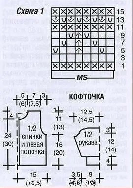 Сборка: выполнить швы, втачать рукава; по вырезу горловины набрать 70 (78) п., связать с 11-го по 14-й р. ажурного узора, 6 р. резинки и петли закрыть. По краям полочек набрать по 93 (113) п. и связать 2 см резинкой, при этом через 1 см равномерно выполнить на правой планке 6 отверстий для пуговиц и петли закрыть. Пришить на левую планку пуговицы. Пришить бантики.