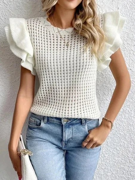 Акцент в этой модели сделан на красивые рукава-крылышки. Они пышные, немного сосборенные по контуру проймы, да еще и двойные.