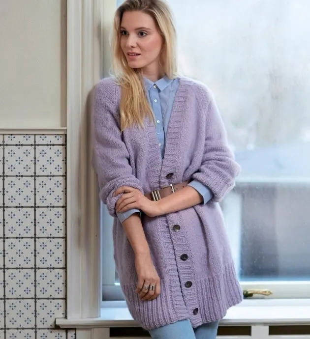 Пряжа (80% шерсти альпака, 20% акрила; 50 г/100 м) — 10 (11) 12 (13) мотков нежно-сиреневой; спицы №4,5 и 5; круговые спицы №4 (3 шт. длиной по 80 см); 6 пуговиц диаметром 23 мм.