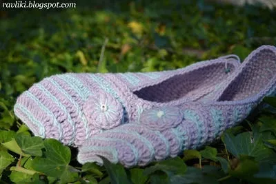 По краю тапочки обвязываем столбиками без накида, но в процессе вязания я прокладывала дополнительную ниточку. Оба ее хвостика выведены назад, на пятку, поэтому их можно тянуть и завязывать бантиком.