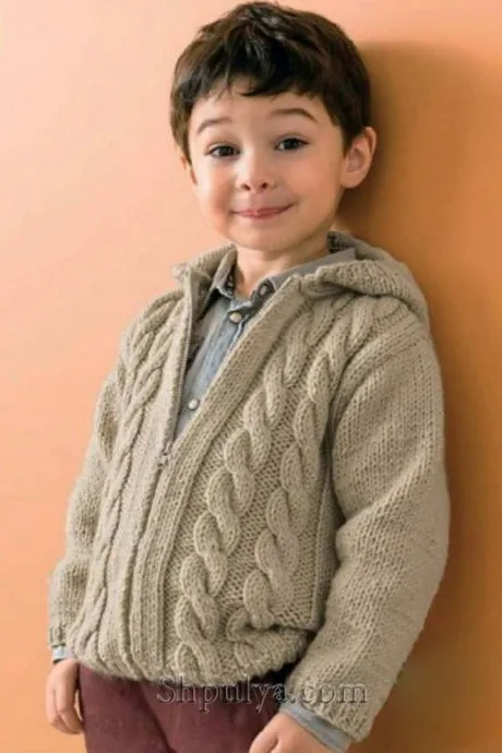 Теплый жакет капюшоном и косами для мальчика 2-10 лет связан спицами из полушерстяной пряжи.