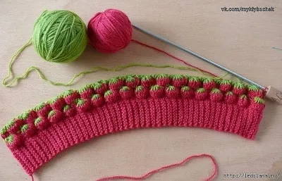 1 ряд — это воздушные петли кр. нитью (кратно 4 +2), 2 ряд — (зел. нить) 3 возд п. для подъема 2 ст. с нак. * (кр. нить)4 ст. с двумя нак., (зел). 3 ст. с нак.* (все нити проводить перед вязанием. 3 ряд — (зел) 1 в.п. *4 полуст без накида вязать между кр ст. предыд ряда, потом их закончить. провязав вместе, 3 ст. без нак.* 4 ряд — (кр. нить) 3 возд.п. для подъема, 1 ст. с нак. а дальше как 2 ряд от * до*красной нитью придется вязать с двух мотков. Лицевые ряды нечетные.