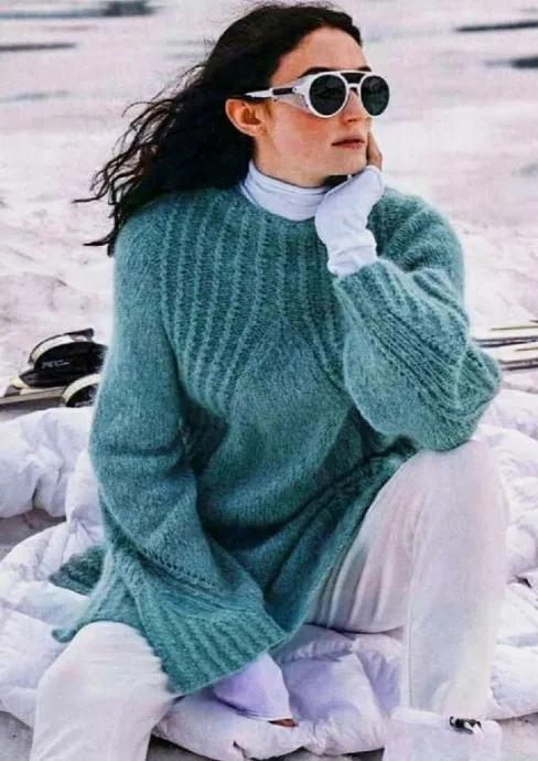 Вам потребуется: 550 (600) 650 г мятно-зеленой пряжи (50% шерсти альпака, 50% шерсти; 100 м/50 г); спицы № 6; круговые спицы № 6.