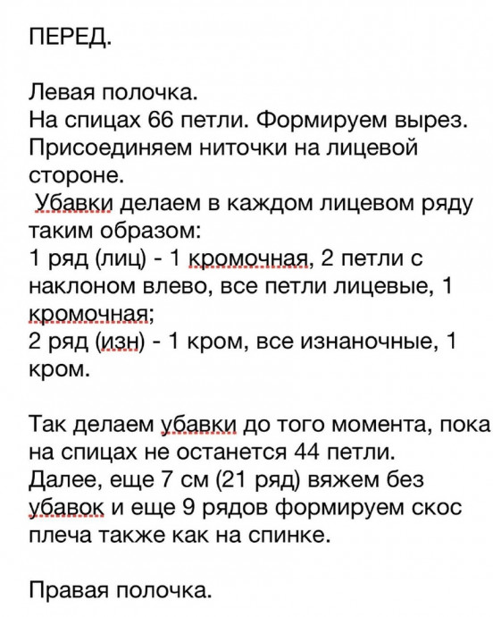 Провязываем 66 петель правой полочки, затем 132 петли спинки, доходим до 66 петель левой полочки ее мы НЕ ПРОВЯЗЫВАЕМ и с этого момента вяжем только спинку.