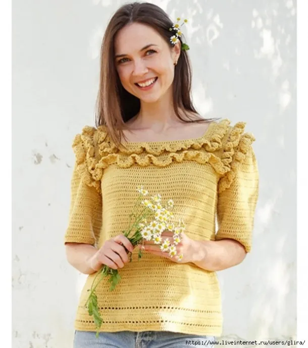 Теперь вяжите волан поверх пропущенных для рукава петель, начните с правой стороны следующим образом: