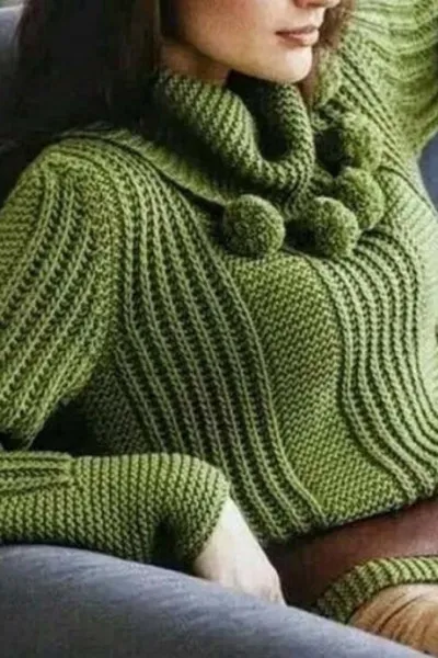 Выполнить все швы, и вшить рукава. Для воротника, наберите на спицы 20 петель и вяжите полосу платочной вязкой, равную размеру горловины. Пришейте воротник к горловине. Сделайте 4 маленьких помпончика и пришейте к краю воротника.