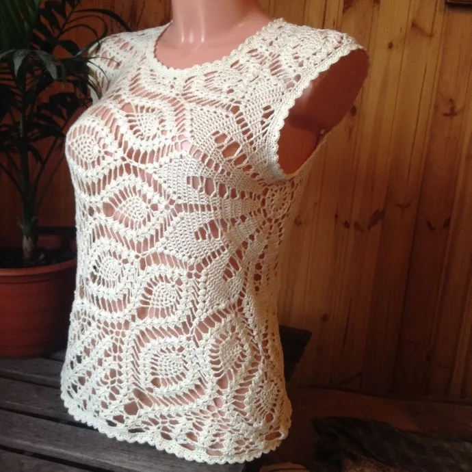 Привет!Тут недавно на глаза попалась схема топа из японского журнала,в основе которого была схема салфетки с узором "ананас".И так как у меня была подходящая пряжа, я решила его связать для дочери.Вязала ровно два дня.В работе использовала пряжу "Coco"VITA cotton,240 м в 50 г.100 % мерс.хлопок.Ушло около 200 г.Крючок 1,5.Размер 44 - 46.И вот что у меня получилось.Дочке понравилась работа,фото на ней пока нет.И вот схемы для тех,кто пожелает повторить.Спасибо всем,кто заглянул!