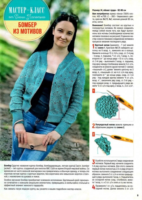 Бомбер связан из 100% хлопка АННА 14, 100 гр. 450м. Расход пряжи для размера 46-48 650 гр., Крючок ✓ 1,75.