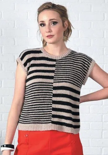 Полоски выполняются методом «интарсия». Каждая секция выполняется с использованием 4-х клубков: по одному клубку нитей МС и СС для каждой стороны. Перекрещивать нити в центре вязаного полотна, даже если цвет нити не меняется.