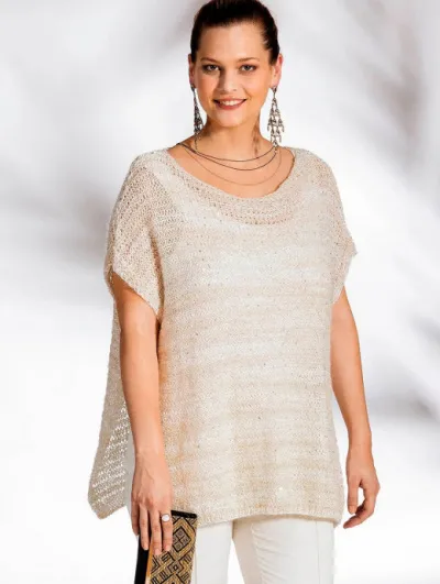 Металлизированная пряжа (31% полиамида, 25% полиэстера, 18% хлопка, 16% вискозы, 10% мохера; 100 м/50 г) – 400 (450) 500 (550) г белой; спицы № 5 и 9.
