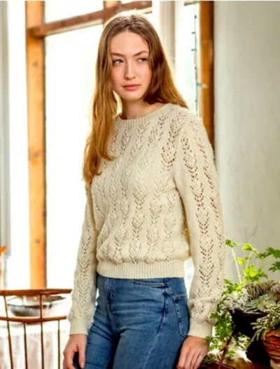 Выполнить плечевые швы. Для воротника на спицы 3.25 мм поднять по краю выреза горловины 118 п. и вязать по кругу 2.5 см резинкой 1х1, закрыть петли по рисунку. Вшить рукава и выполнить боковые швы и швы рукавов.