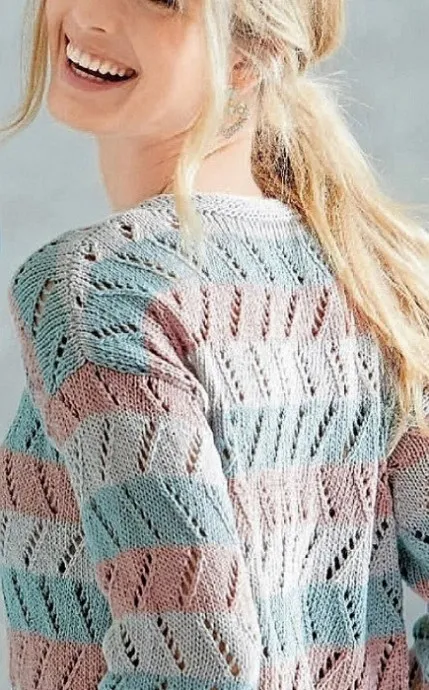 Лёгкий джемпер спицами с сочетанием ажурного узора и цветных полосок