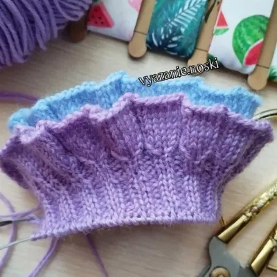 Для двойного рюша следует набрать на вторые спицы такое же количество петель и провязав рюши выполнить резинку на 10 рядов выше. Затем наложить рюши один на другой и совместив петли провязать по одной петле с каждой спицы вместе, соединяя их таким образом.