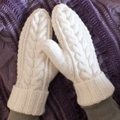 Концы нитей (в верхней части и на кончике большого пальца) пропустить внутрь варежки и закрепить. Вторую варежку вязать в зеркальном отображении, делая прибавки для клина перед и после 4-й лиц. петли.