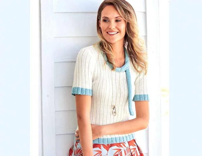 Перед и спинка нитью цвета морской волны на спицы №4 набрать 266 (294-322-350) п. и вязать круговыми рядами резинкой, при этом начать с 1 изн., 5 лиц., 2 изн. Линии боковых швов отметить маркерами - в начале круг.р. и посередине круг.р. = 133 (147-161-175) п. для каждой половинки детали. Через 3 см = 12 круг.р. от наборного ряда продолжить вязать белой нитью на спицах №3. Через 36 см = 138 круг.р. от наборного ряда работу разделить по боковым линиям для пройм и сначала закончить перед. Для пройм закрыть с обеих сторон 1 раз по 2 п., затем в каждом 2-м р. закрыть 1 раз по 2 п. и 2 раза по 1 п. = 121 (135-149-163) п. Через 2 (4-6-8) см = 8 (16-22-30) р. от начала пройм закрыть для горловины с 40-й по 55-ю (с 47-й по 71-ю - с 54-й по 78-ю - с 61-й по 85-ю) п. и сначала закончить правую сторону детали (правую сторону изделия во время носки). Для закругления выреза с внутреннего края закрыть в следующем 4-м р. 1 раз 9 п. и в каждом 6-м р. 1 раз 3 п., 1 раз 2 п. и 2 раза по 1 п. Через 13,5 см - 52 р. от начала горловины закрыть оставшиеся 39 (46-53-60) п. Левую сторону детали вязать по прямой и через 13,5 см = 52 р. от начала проймы закрыть оставшиеся 39 (46-53-60) п. Спинку вязать без выреза горловины и через 15,5 (17,5-19,5-21,5) см = 58 (66-74-82) р. от начала пройм закрыть оставшиеся 121 (135-149-163) п.
