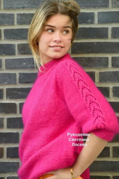 Свитер имеет тонкий узор с ажурами на плечах и рукавах длиной 3/4. Детали переда и спинки вяжутся лицевой гладью, а рукава - изнаночной гладью. Джемпер имеет планку резинкой 1х1 на рукавах и по низу, а также подвернутую планку по вырезу горловины. Джемпер связан из мягкой пряжи и очень удобен в ношении.