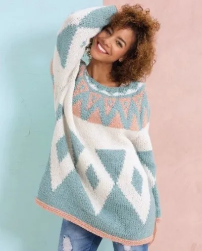 Трехцветная модель с крупными вывязанными ромбами и броской круглой кокеткой — уникальная вещь, которую не найдешь в магазине.