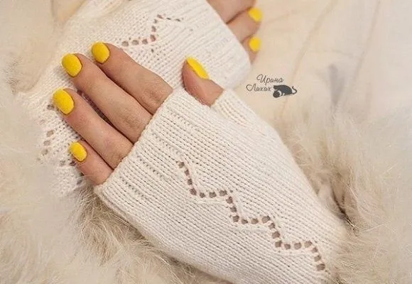 Далее вязать на 46 п. круг. р., при этом на внешней стороне руки продолжать выполнять ажурный узор и в след. круг. ряду убавить 2 п. мостика, для чего первую петлю перед мостиком и первую петлю мостика провязать вместе лиц., 3 лиц. петли, и след. 2 п. — вместе лиц. В след. 2-м круг. р. продолжить убавление, провязав вместе, вывязанную петлю из убавления вместе со следующей петлей мостика, 1 лиц. п., и след. 2 п. — вместе лиц. = 42 п. Далее снова вязать прямо. Провязав 3,5 зигзага ажурный узор закончить.
