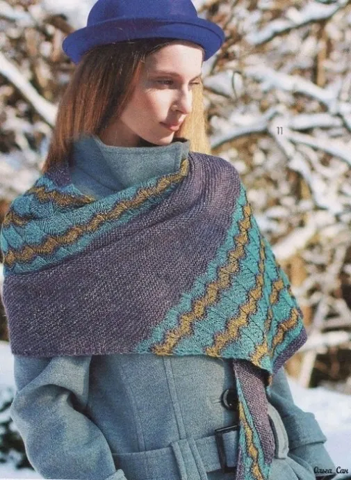 Перед началом работы свяжите образец платочной вязкой, отпарьте и высушите. Сделайте расчет петель на ширину палантина. Наберите на спицы необходимое количество петель и провяжите платочной вязкой 10 рядов. Далее по схеме № 1 вяжите, зигзагообразный узор, чередуя цвета пряжи по Вашему желанию. После этого опять перейдите на платочную вязку основным цветом. Таким образом продолжайте чередовать полосы рисунков. Бактус - один из самых удобных аксессуаров. Его можно носить как только душе угодно, да еще и с любой верхней одеждой