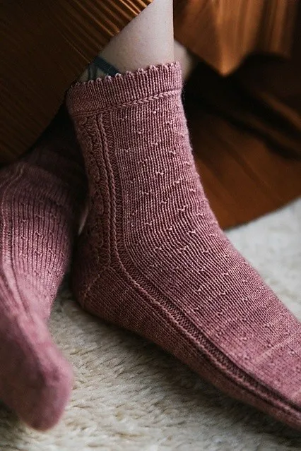 • Дальше вниз носок разделен на две части, с текстурированным узором спереди и цветочным кружевом сзади.