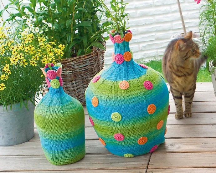 Обычные высокие бутыли могут превратиться в чудесные напольные вазы благодаря плотным чехлам, связанным крючком в технике нукинг.