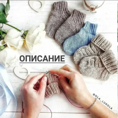 Далее переходим на спицы №3 и продолжаем вязать лицевой гладью. Длина стопы планируется 9,5 см (на 0-3 месяца). Провязав резинку 6-7 см, переходим к лицевой глади 2-3 см в зависимости от того, какой высоты вы хотите отворот. Далее вяжем прямую уплотненную пяточку (лиц. р. - 1п снять лицевой не провязывая, вторую п. провязать лиц и т.д. чередуем до конца лиц. ряда, изн. р. - все изнаночные). Пяточку вывязываем на первой половине петель изделия лицевыми, вторую половину пока отложите на вспомогательную спицу.