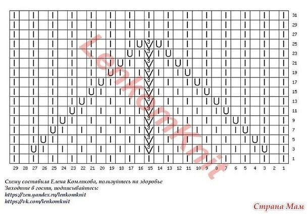 На схеме 2 - раппорт узора для переда в высоту. В ширину раппорт будет с 1 по 21 петли (остальные петли слева - для симметрии, они провязываются в конце детали.