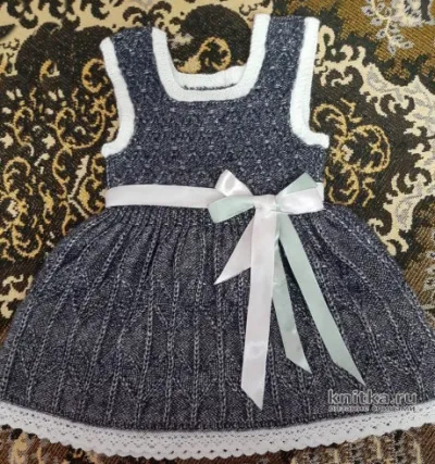 Получившиеся 2 половинки сшиваем. Украсить понизу юбочку вязаным кружевом, для пояса атласную ленточку, края проймы и горловины провязать белой пряжей.
