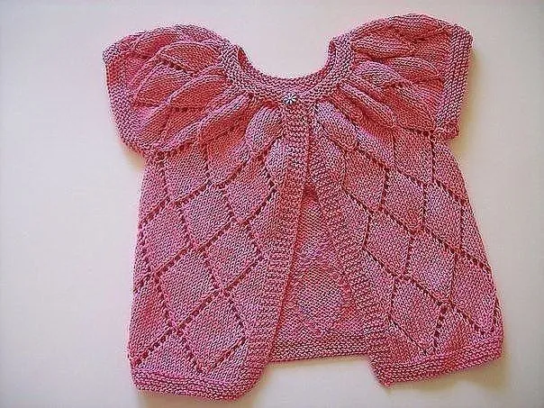 В следующем ряду разделение на перед, спинку, рукава( далее вязать фантазийный узор всегда только с 13-го ряда). Провязать 33 петли первой полочки, набрать 8 петель, переснять следующие 64 петли для первого рукава на нить или петледержатель, вязать 55 петель спинки, набрать 8 петель, переснять следующие 64 петли для второго рукава на нить и провязать последние 33 петли второй полочки. Продолжить вязать только 137 петель тела. Вязать до нужной длины кофточки, либо до 22-го, либо до 32 ряда узора. Провязать 7 рядов платочной вязкой, петли закрыть.